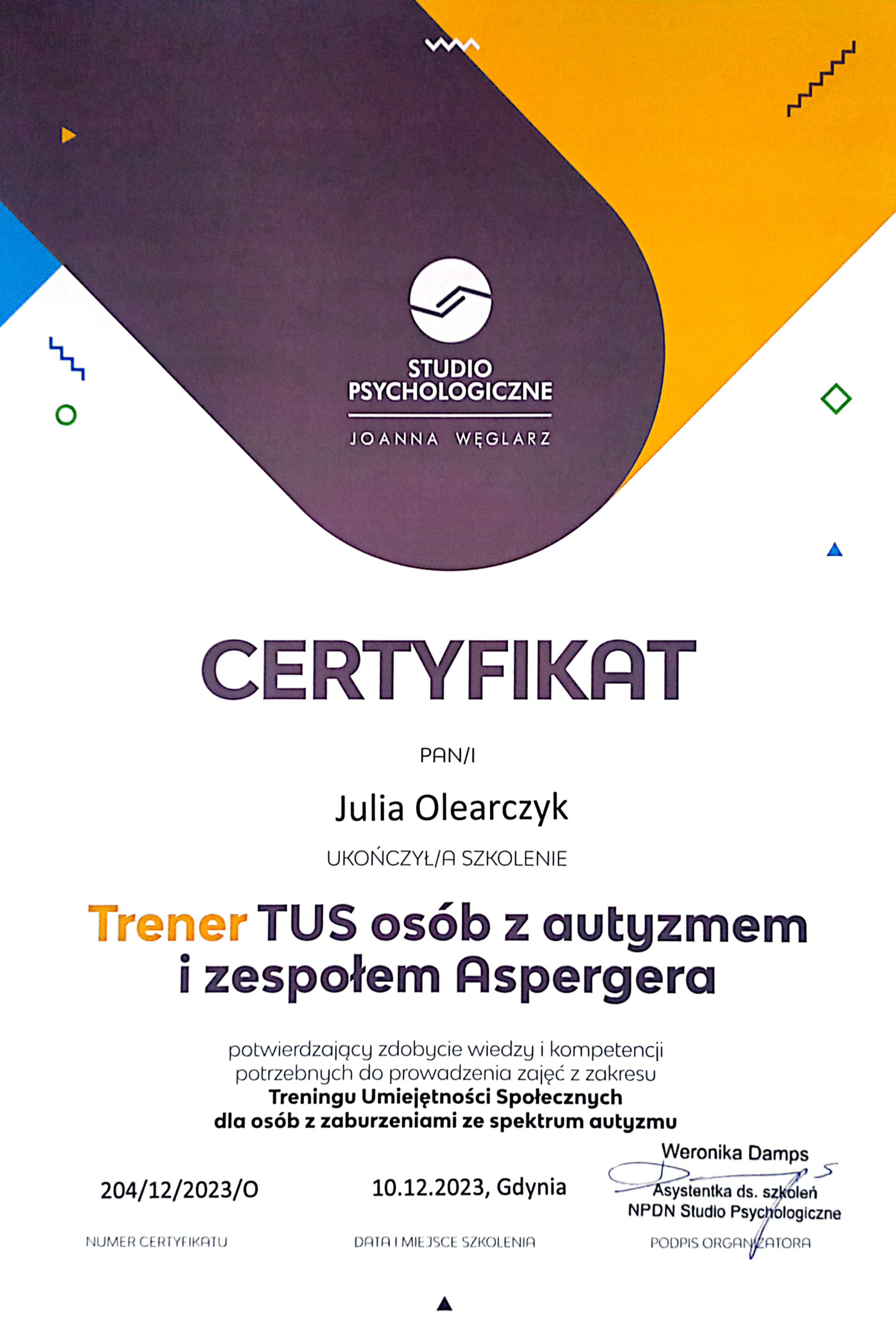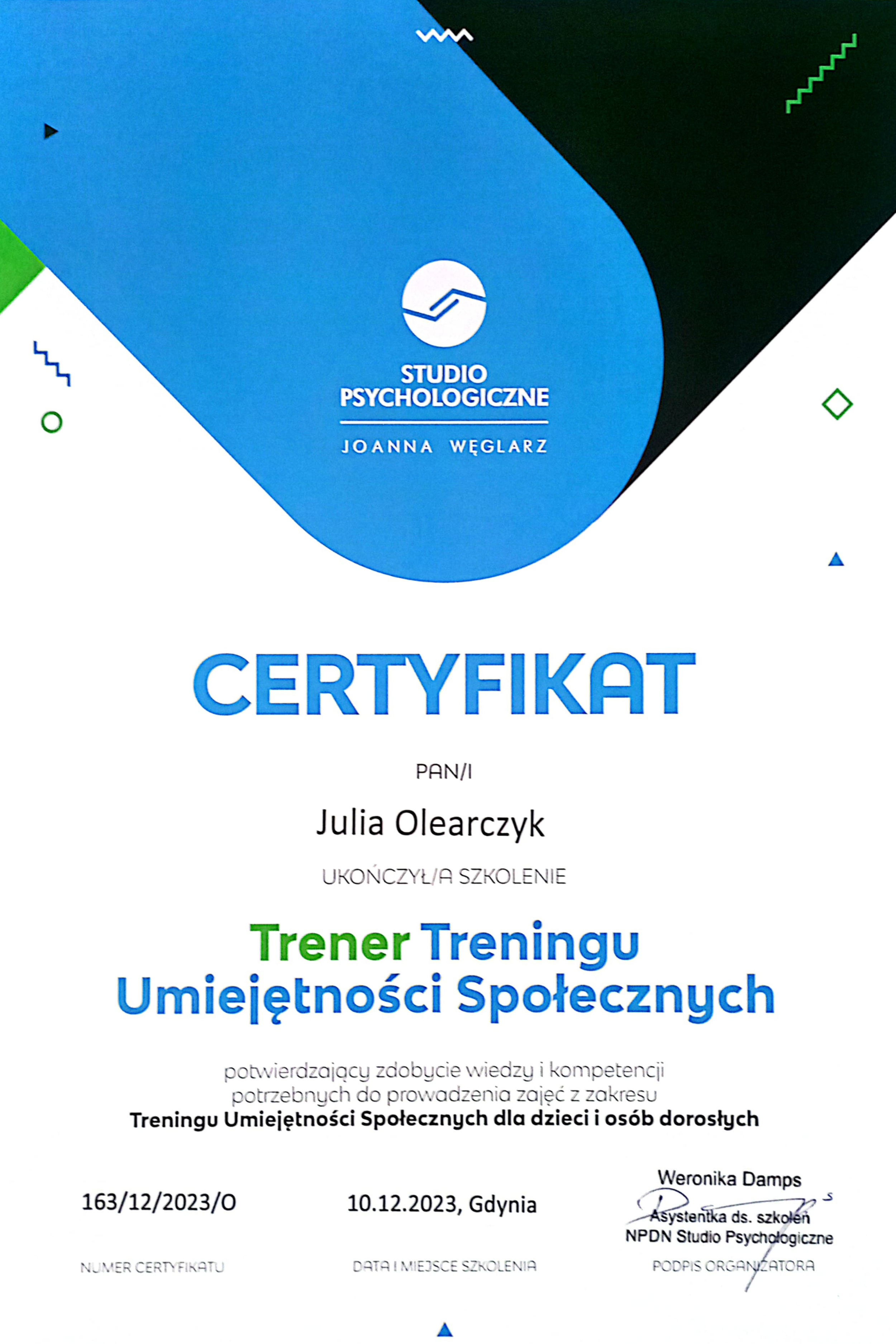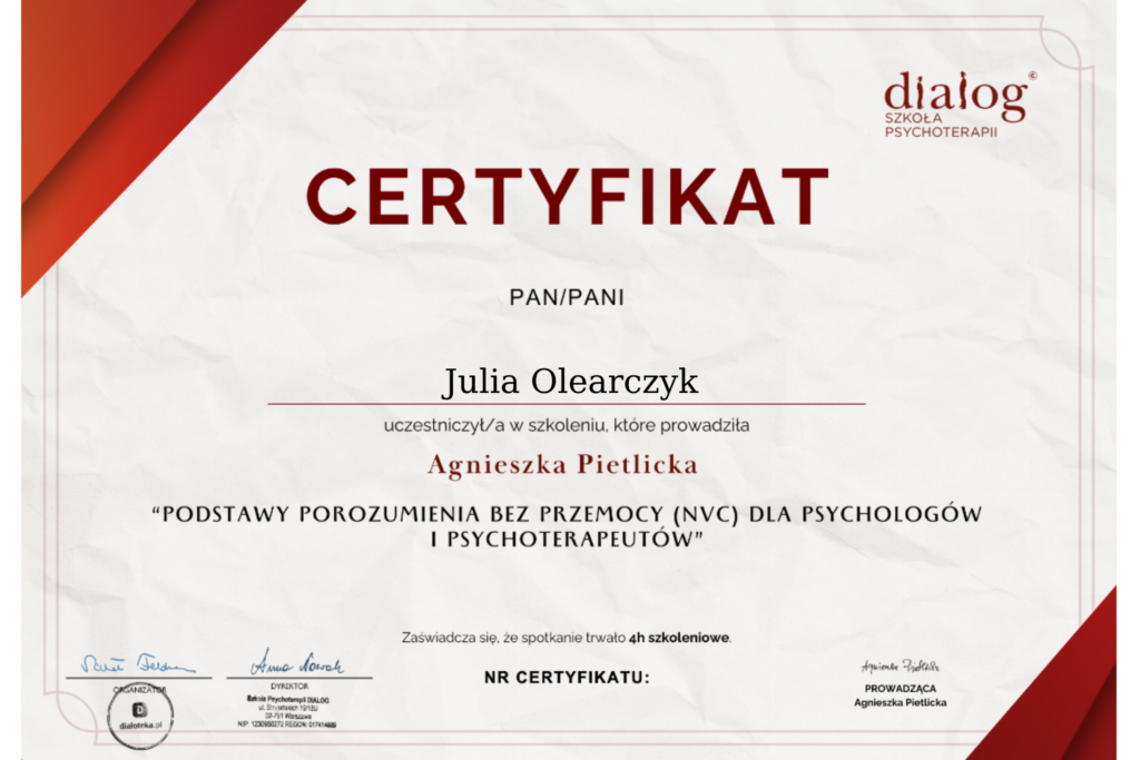 Trenerką Umiejętności Społecznych oraz Trenerką Kontroli Złości, Agresji i Emocji Trudnych.